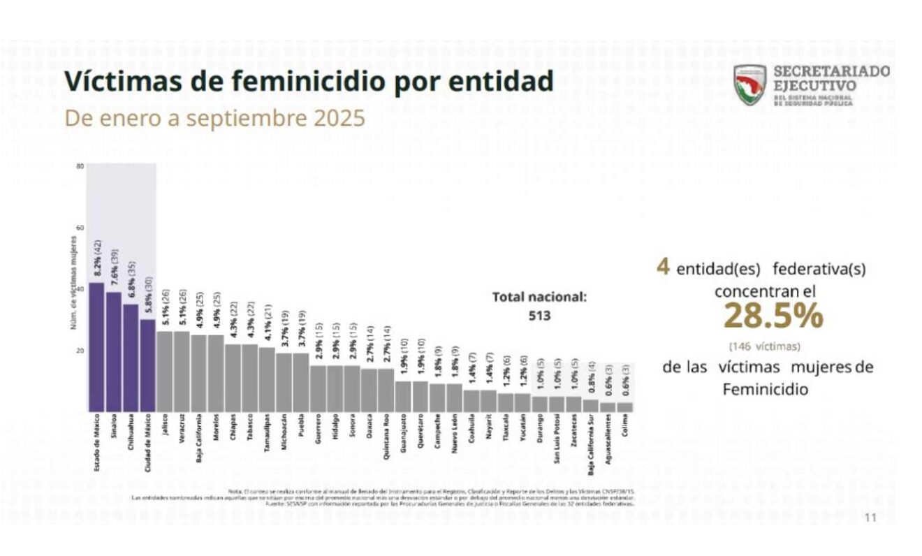 Aunado a ello, con base en el Informe de Violencia contra las Mujeres, Incidencia Delictiva y Llamadas de Emergencia al 911, del Centro Nacional de Información (CNI), la entidad ocupa el segundo lugar nacional en la tasa de violación simple y equiparada, con 25.36 por cada 100 mil habitantes por entidad y 533 casos.
