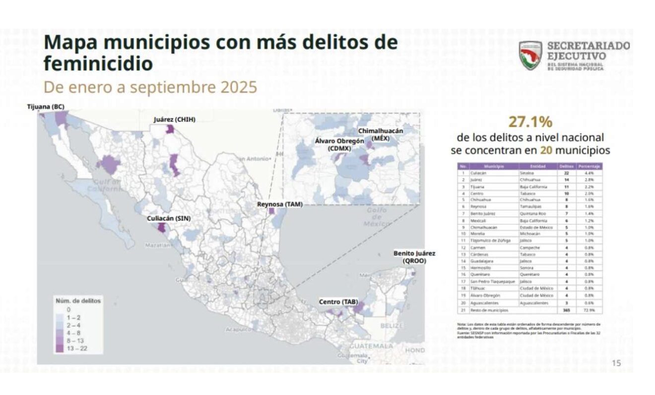 De acuerdo con esta organización, el caso más alarmante es Benito Juárez, municipio que se encuentra entre los 20 que concentran el 27.1 por ciento de feminicidios, de acuerdo con datos emitidos por las fiscalías del país al corte del pasado 30 de septiembre.