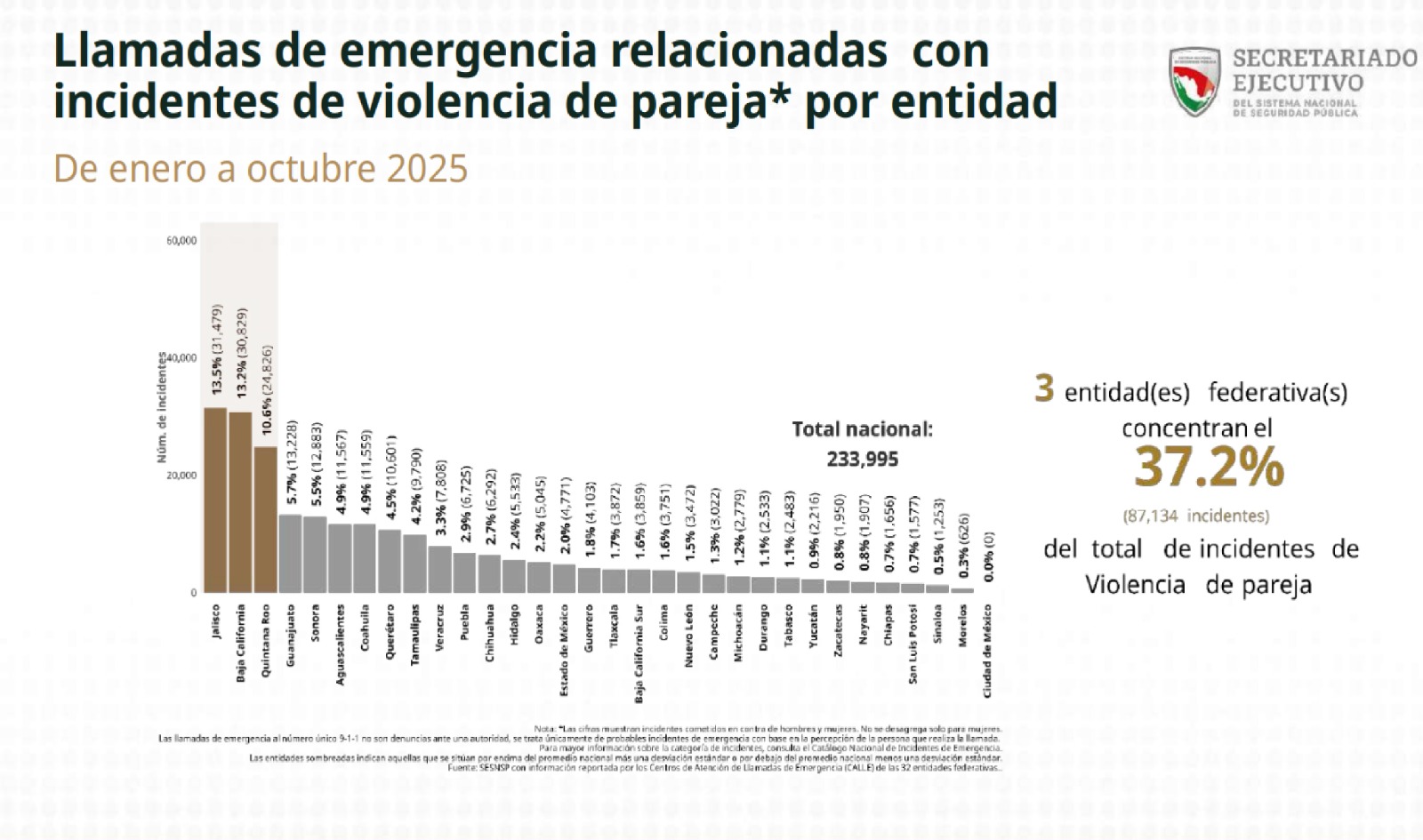 Por ejemplo, Quintana Roo está dentro de las tres entidades federativas que acumulan el 37.2 por ciento de los delitos relacionados con los incidentes de violencia de pareja; de enero a octubre el primer lugar lo tiene Jalisco, con 13.5 por ciento; el segundo lo tiene Baja California con 13.2 por ciento y le sigue Quintana Roo con el 10.6 por ciento.