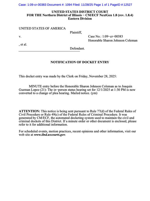 “Entrada de acta ante la Honorable Sharon Johnson Coleman en relación con Joaquín Guzmán López (21): La audiencia presencial sobre el estado del caso, programada para el 1/12/2025 a la 1:30 de la tarde, se ha convertido en una audiencia de cambio de declaración. Notificación enviada por correo”, dice el breve documento.