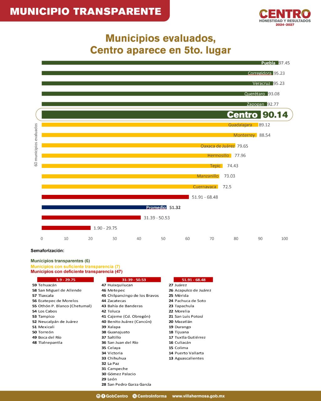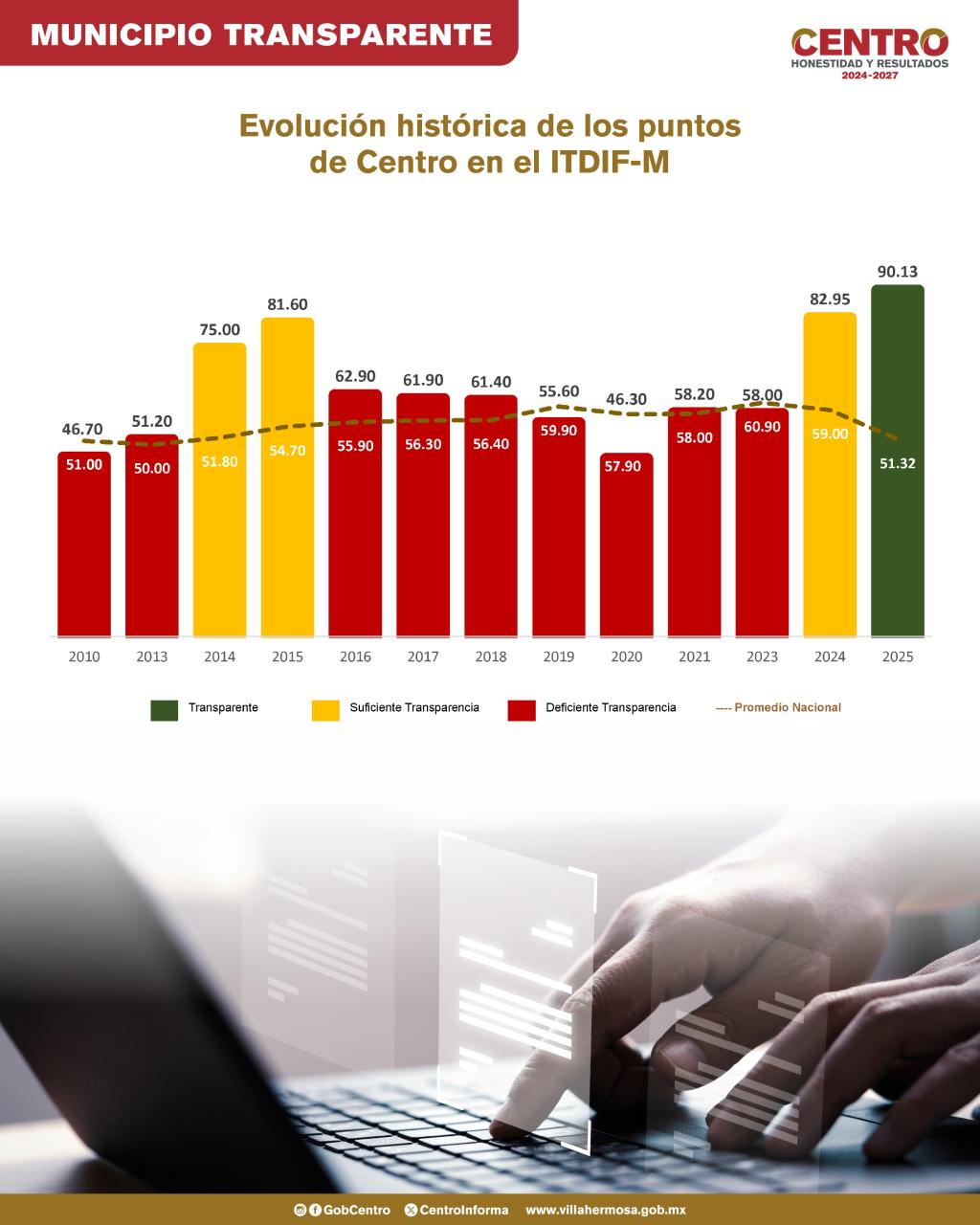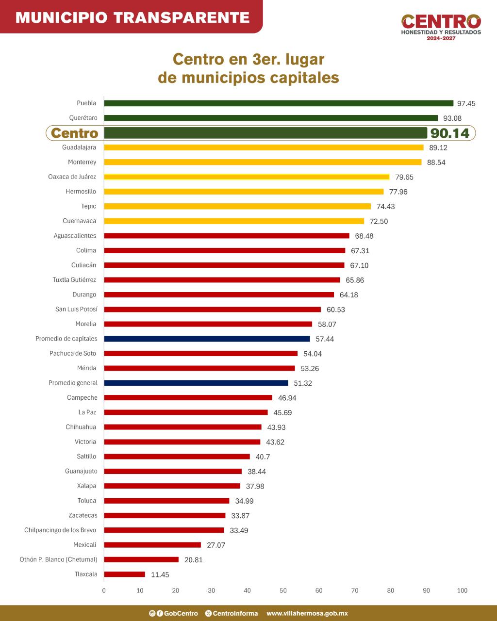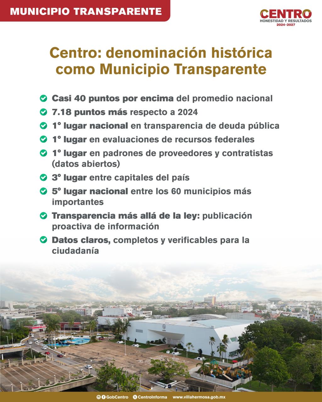 “Este año, logramos un puntaje histórico en transparencia fiscal: alcanzamos la categoría de Municipio Transparente, con más de 90 puntos; subimos del sexto al quinto lugar entre 60 municipios y somos la tercera capital mejor evaluada. Confirmamos que la disciplina, el orden y la transparencia son bases firmes para construir un Centro con visión de futuro”, aseguró la Presidenta Municipal en sus redes sociales.