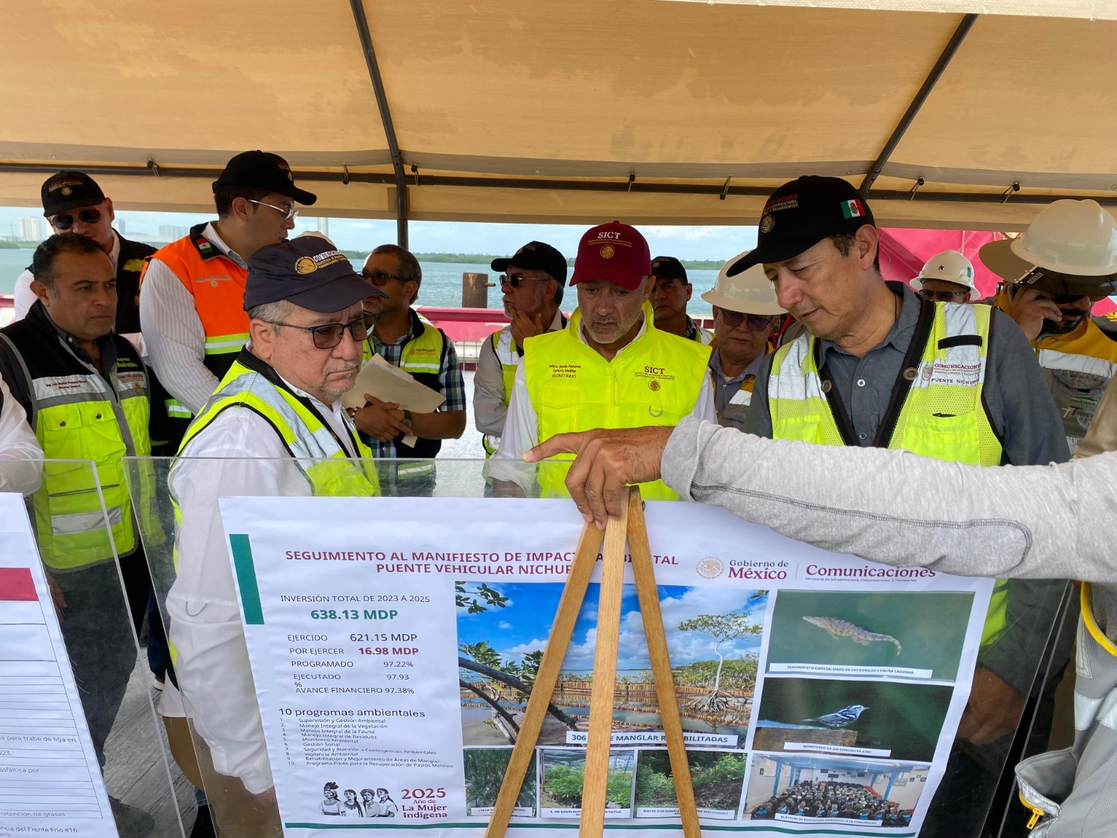 En ese contexto, el secretario de la SICT, Jesús Antonio Esteva Medina, supervisó la construcción del Puente Vehicular Nichupté, donde constató que presenta un avance del 95 por ciento. El proyecto, ejemplo de la ingeniería mexicana, ha generado alrededor de 51 mil empleos directos e indirectos y permitirá un ahorro en los traslados de 45 minutos, esto brindará a los trabajadores una forma más rápida de llegar a sus trabajos y hogares.