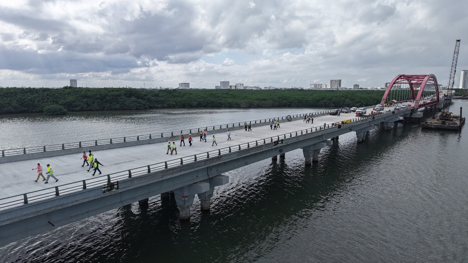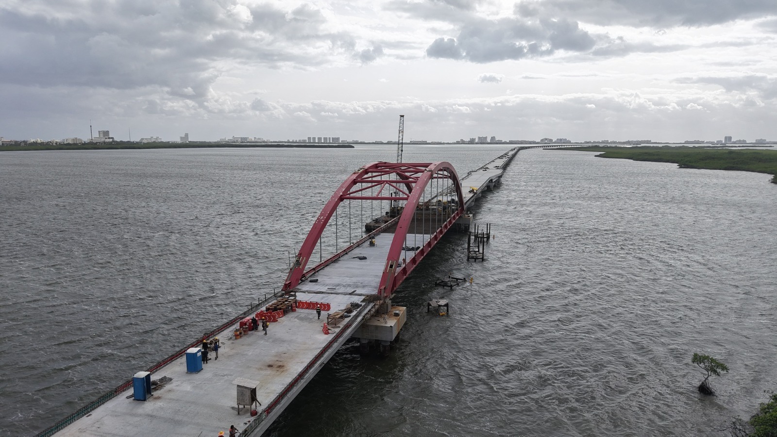 El puente, de 8.8 kilómetros (con tres carriles, uno de ellos reversible); dos entronques, de 2.4 km (uno del lado del Bulevar Luis Donaldo Colosio y otro en el Bulevar Kukulcán), así como un puente en arco metálico, de 103 metros y ciclovías, mejorará la conectividad, dará seguridad y generará empleos directos. Cuando esté concluido se prevé un tránsito diario promedio anual de 12 mil 612 vehículos. El puente beneficiará a 1.3 millones de habitantes y a 20 millones de turistas que anualmente visitan la zona. La constructora ultima detalles para poder cumplir con la entrega a fines de este mes.