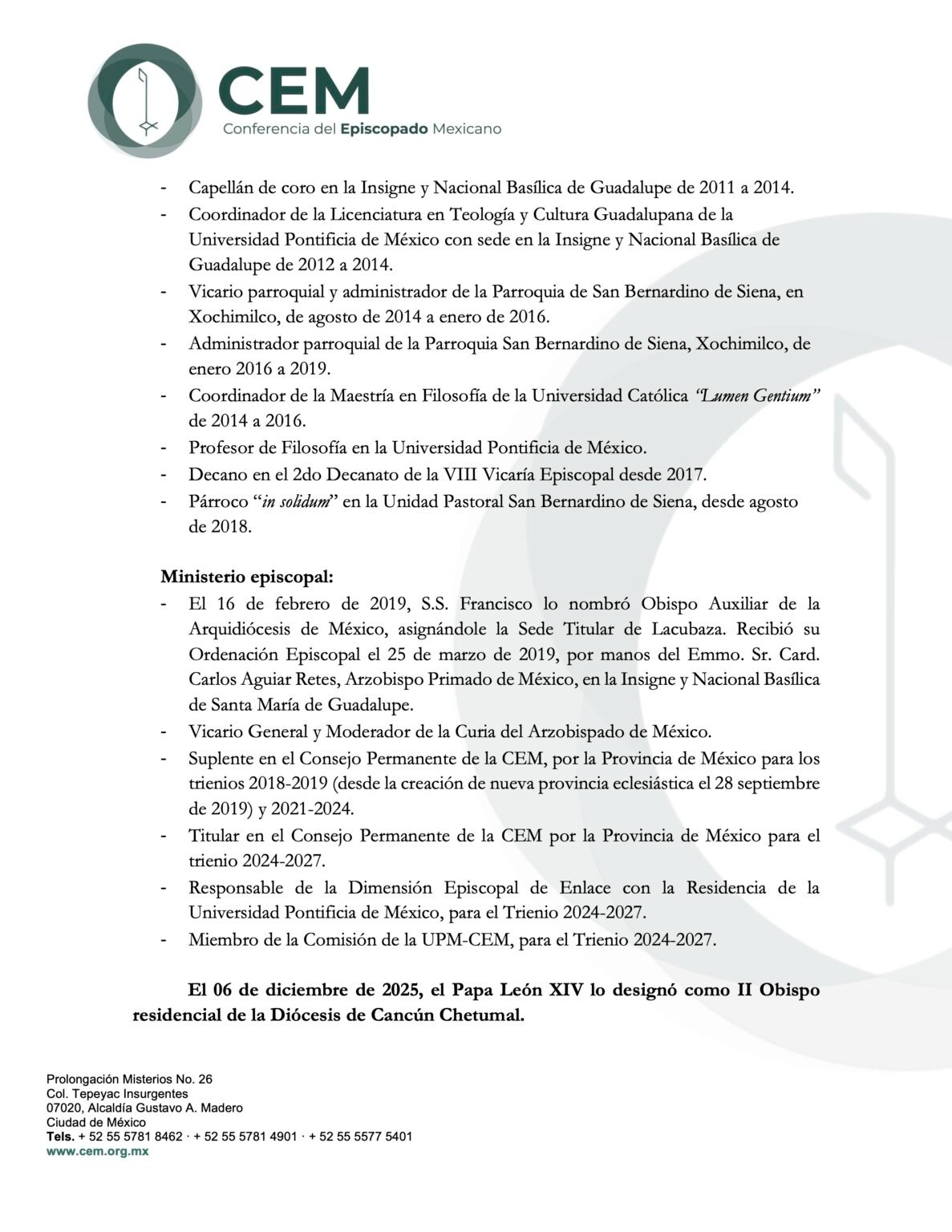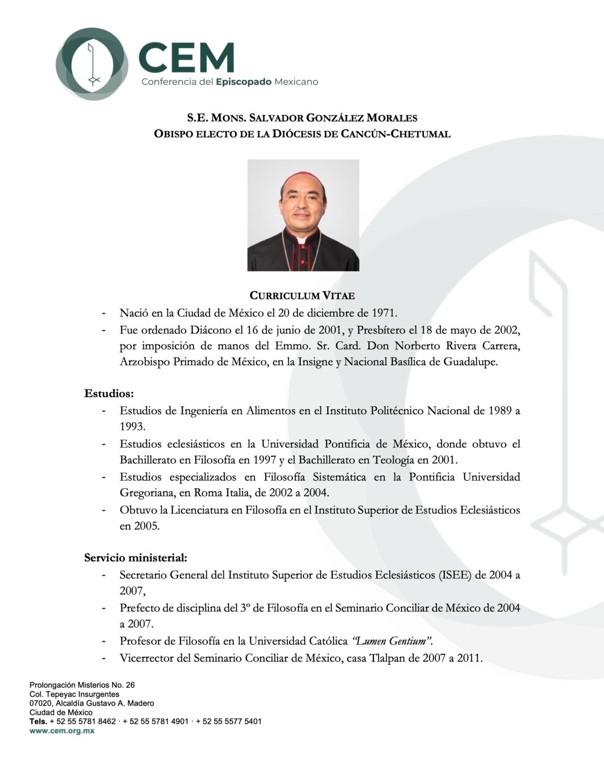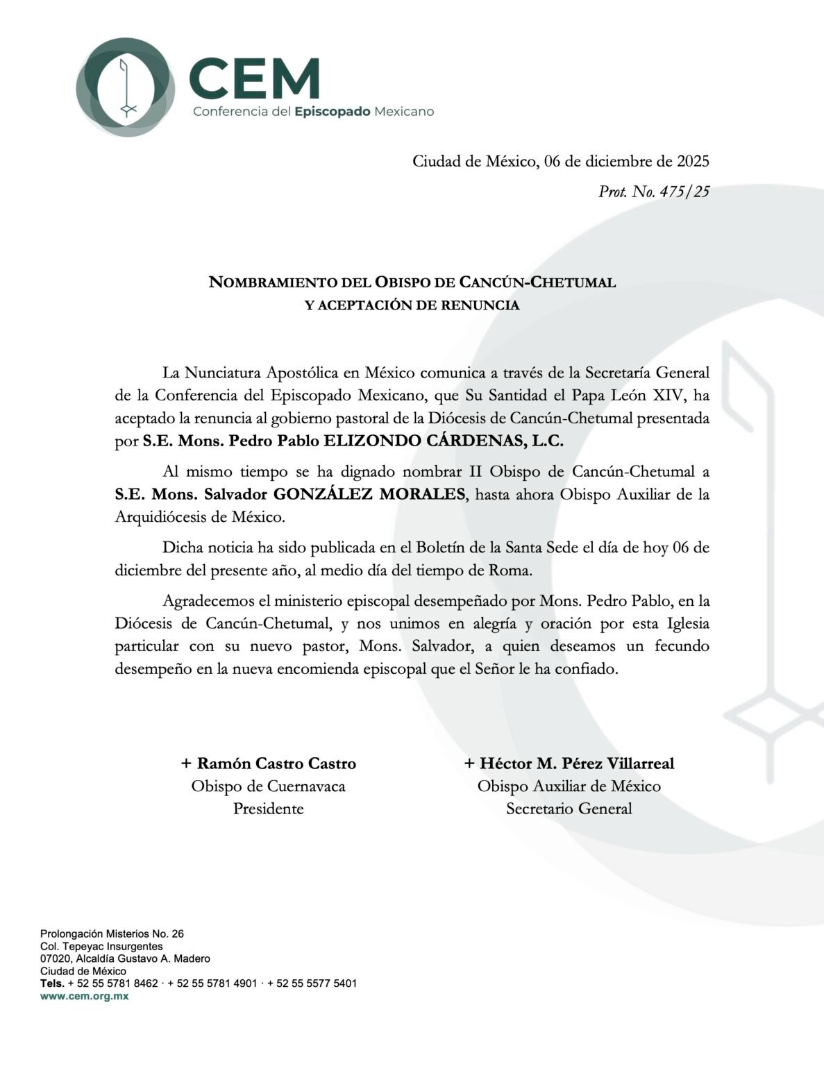 “La Nunciatura Apostólica comunica, a través de la Secretaría General de la Conferencia del Episcopado Mexicano, que Su Santidad León XIV se ha dignado nombrar Obispo de la Diócesis de Cancún-Chetumal, a S.E. Mons. Salvador González Morales, hasta ahora Obispo Auxiliar de la Arquidiócesis de México. Nos unimos en alegría y oración con la Iglesia que peregrina en la Diócesis de Cancún-Chetumal y deseamos un fecundo desempeño en su nueva encomienda episcopal que el Señor le ha confiado”, menciona el comunicado.