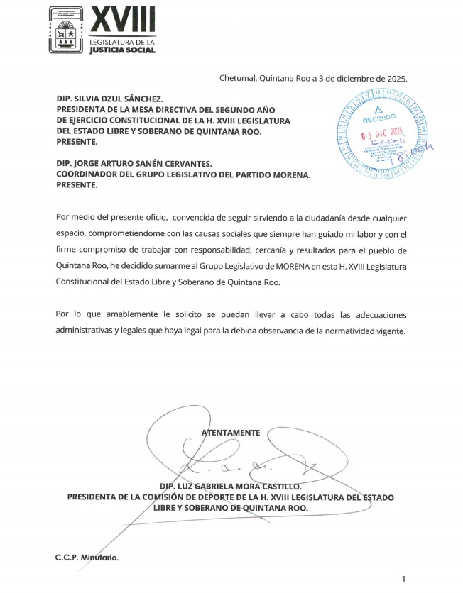 La noticia se dio a conocer a través de un oficio que la legisladora dirigió el pasado 3 de diciembre a la presidenta de la mesa directiva, Silvia Dzul Caamal, con copia al coordinador de la bancada de Morena, Jorge Sanén Cervantes.