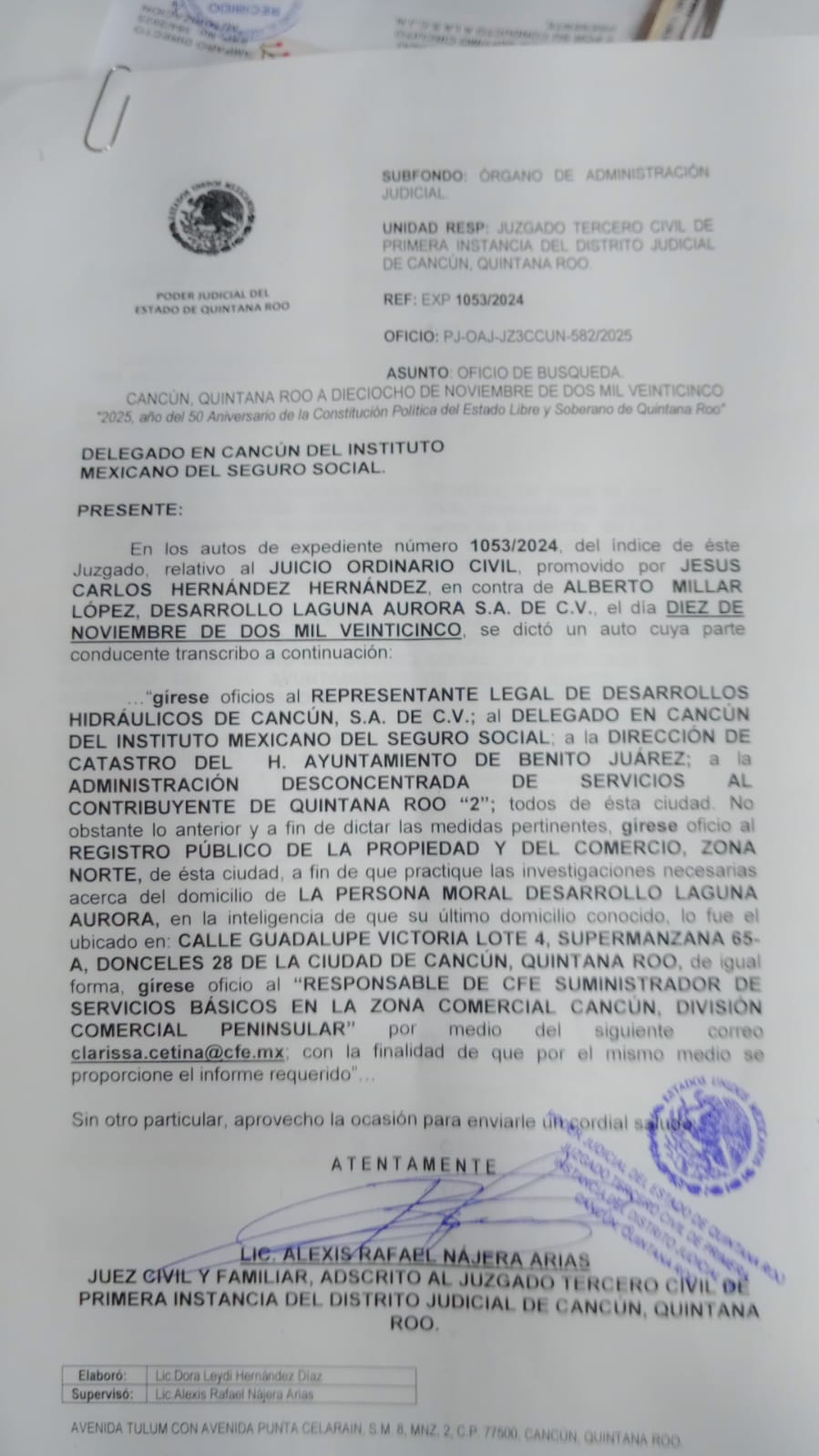 El oficio de búsqueda está firmado por Alexis Rafael Nájera Arias, Juez civil y familiar adscrito al juzgado tercero civil de primera instancia del Distrito Judicial de Cancún y dirigido a todas las instancias públicas que solicitan datos personales para poder entregar permisos o realizar contrataciones de servicios.