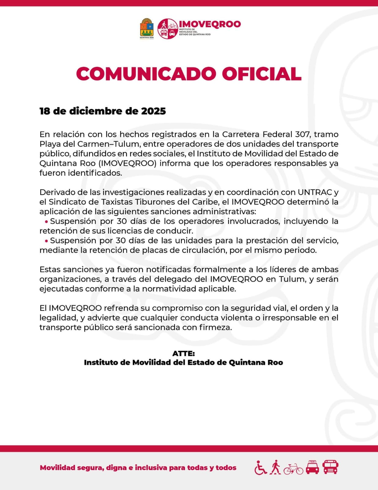 Horas después de que este hecho ocurriera, el Instituto de Movilidad del Estado de Quintana Roo (Imoveqroo) informó, mediante un comunicado, que los operadores responsables ya fueron identificados.