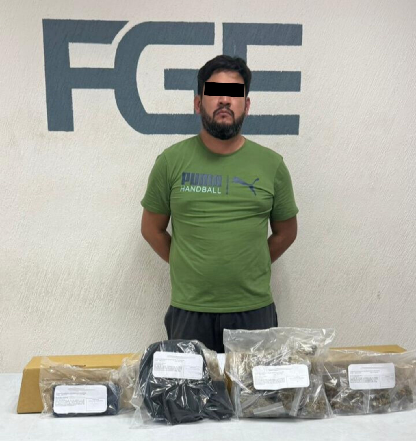 Cerca del inmueble cateado, los agentes observaron a un masculino identificado como Johann Antonio “N”, quien se encontraba manipulando presuntos estupefacientes en la cajuela de un vehículo, por ello, procedieron a revisarlo, encontrando entre sus pertenencias hierba verde con características similares a la marihuana y un teléfono celular.