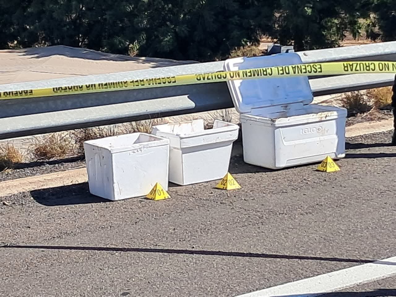Las autoridades informaron que los restos estaban distribuidos en dos hieleras de unicel y una de plástico, encontradas a la altura del kilómetro 193 de la mencionada vialidad.