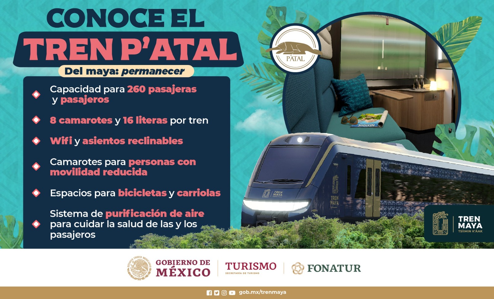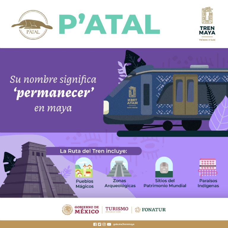 El tren P’atal tiene capacidad para 260 pasajeros, cuenta con ocho camarotes y 16 literas por tren. El proyecto contará en total con 42 carros de ferrocarril fabricados por empresa canadienses y francesas.