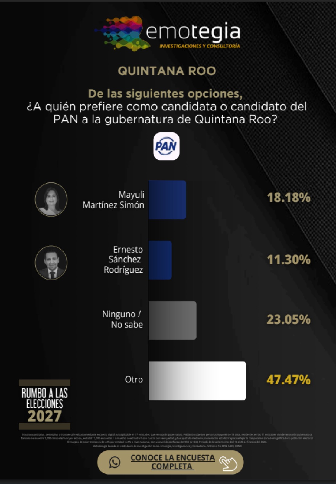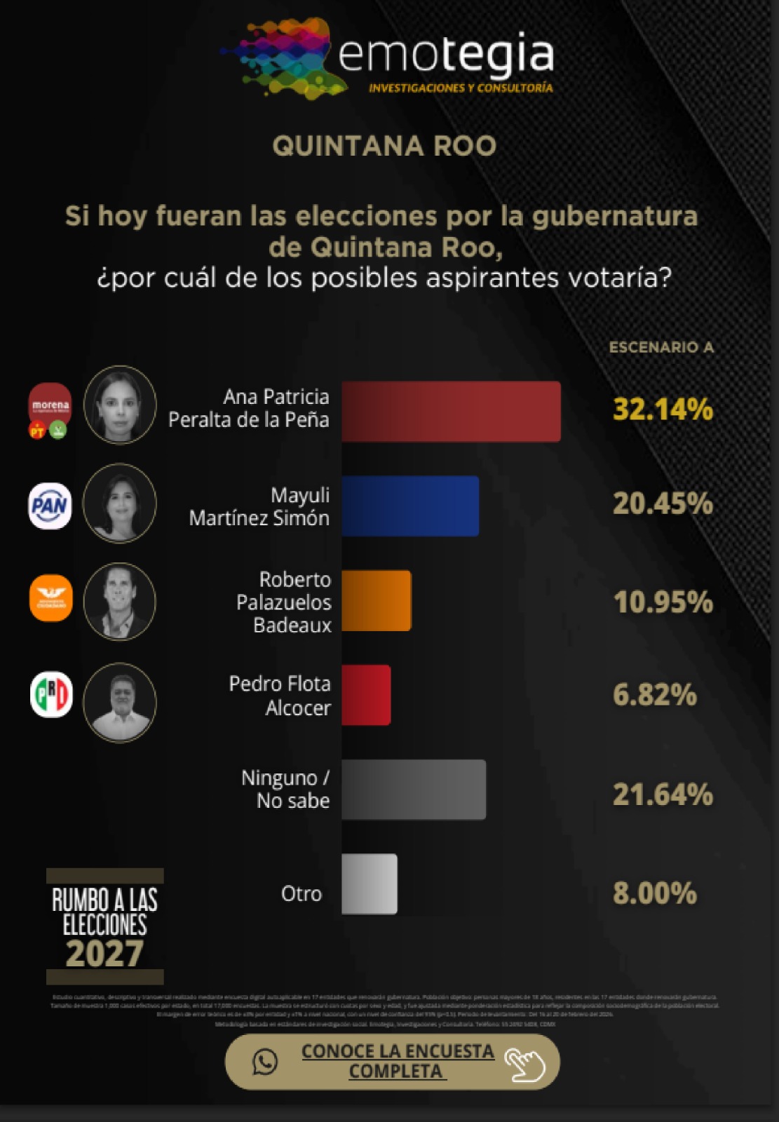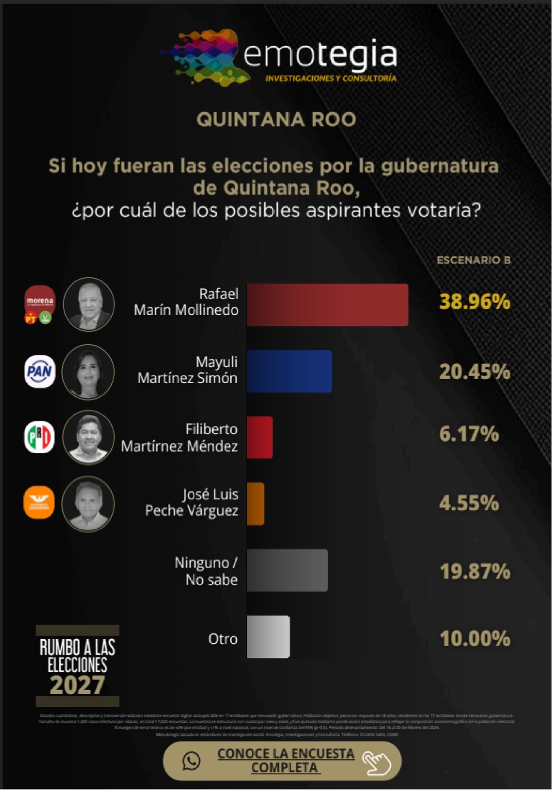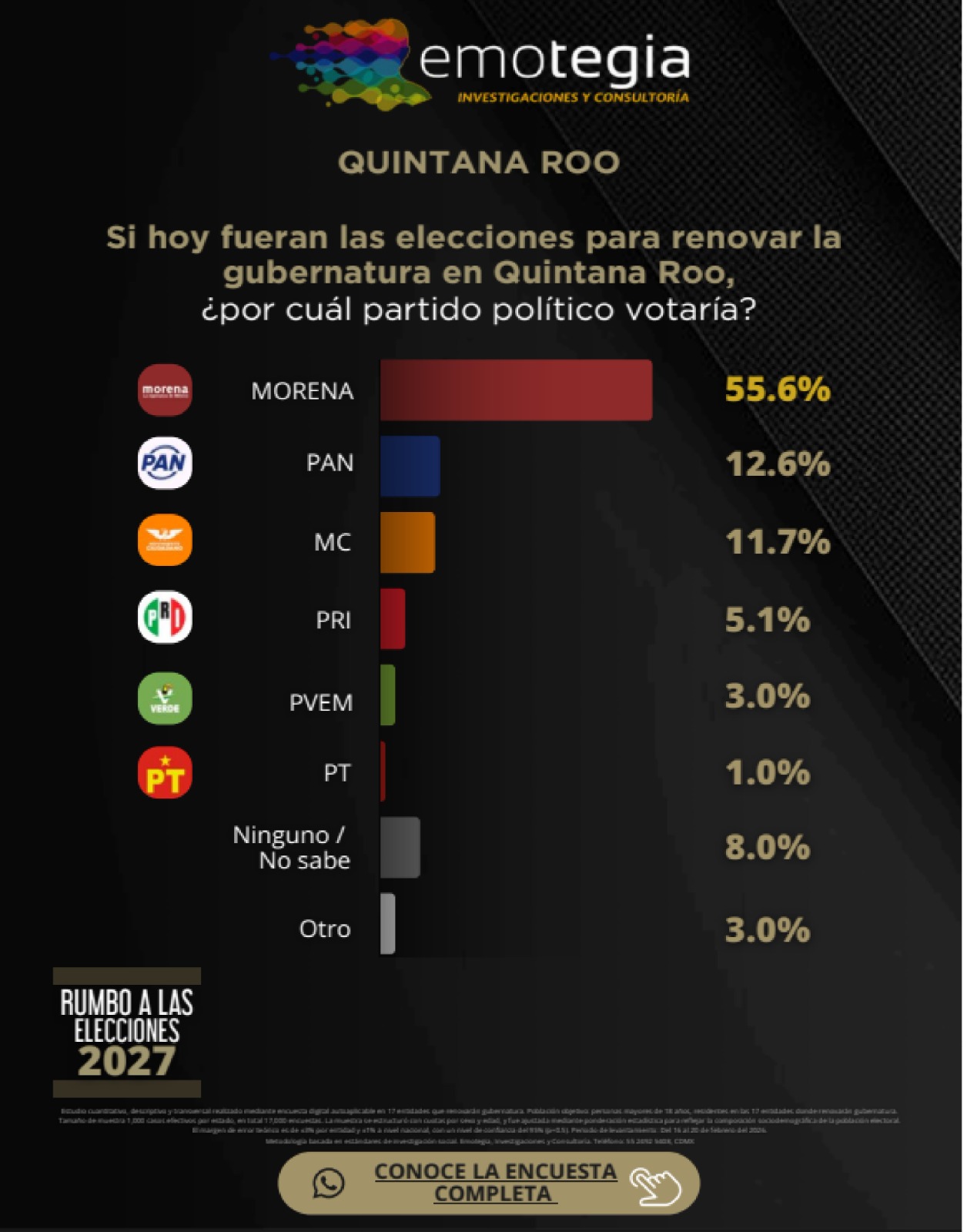 CANCÚN | SIM | La encuestadora “Emotegia”, publicó los resultados de la encuesta levantada del 16 al 20 de febrero de este año, “Rumbo a las Elecciones 2027: El Mapa Político de las 17 Gubernaturas”, donde destaca que el Movimiento de Regeneración Nacional (Morena) ganaría la gubernatura en Quintana Roo.