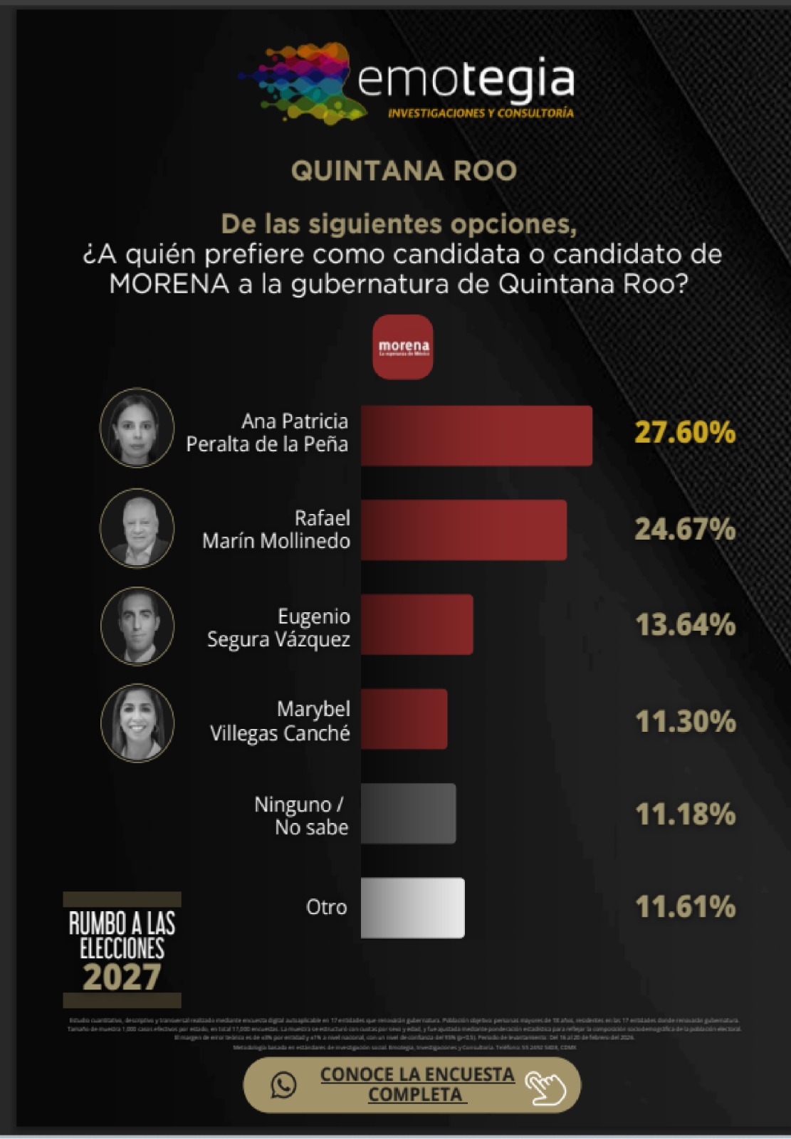 La siguiente pregunta basa su objetivo en la persona que debe encabezar la candidatura a la gubernatura por Quintana Roo para el 2027 en Morena. De las siguientes opciones, ¿a quién prefiere como candidata o candidato de Morena a la gubernatura de Quintana Roo? El 27.60% respondió que a Ana Patricia Peralta de la Peña; un 24.67% menciona que a Rafael Marín Mollinedo; el 13.64% elegiría a Eugenio Segura Vázquez; un 11.30% prefiere a Marybel Villegas Canché; el 11.18% ninguno/no sabe y el 11.61% prefiere a “otro”.