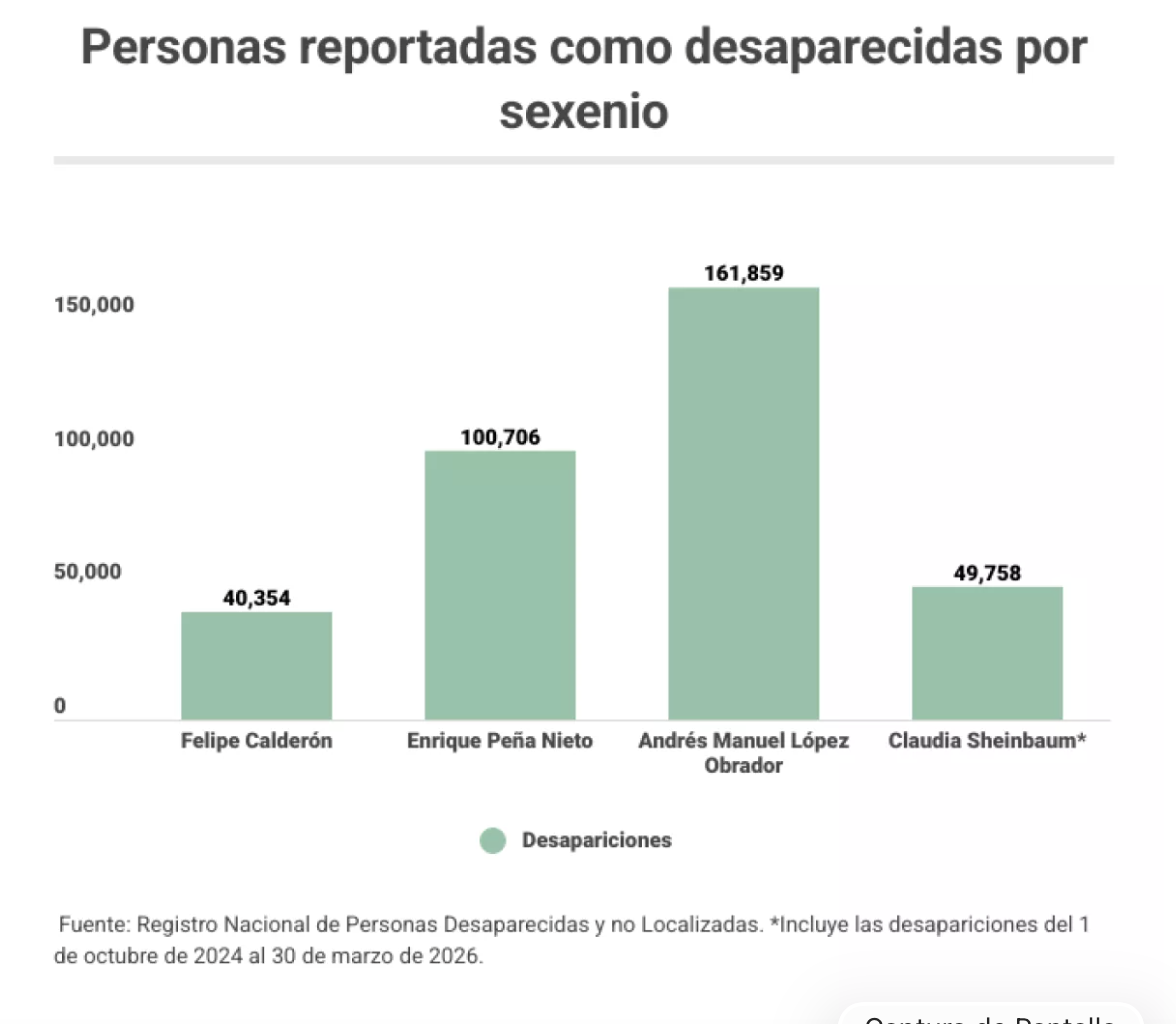 Entre el 1 de octubre de 2024 y el 31 de marzo de 2026 en el país fueron reportadas como desaparecidas 50,026 personas, en promedio de 91 por día, de acuerdo con cifras del Registro Nacional de Personas Desaparecidas y no Localizadas.
