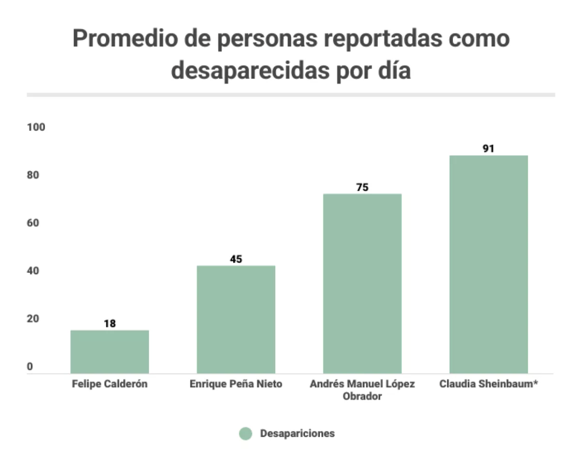 El promedio diario en desapariciones en el actual gobierno, también es el más alto de los últimos cuatro sexenios. Con Calderón fueron 18 desapariciones por día, con Peña Nieto 45 y con López Obrador 75.