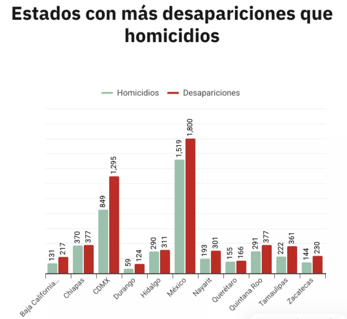 La organización Causa en Común también alertó sobre una posible reclasificación de homicidios dolosos en desapariciones e incluso en 11 entidades en 2025 el número de desaparecidos fue mayor al de muertos con violencia. Entre ellos están Baja California Sur, Chiapas, Ciudad de México, Durango, Hidalgo, Estado de México, Nayarit, Querétaro, Quintana Roo, Tamaulipas y Zacatecas.
