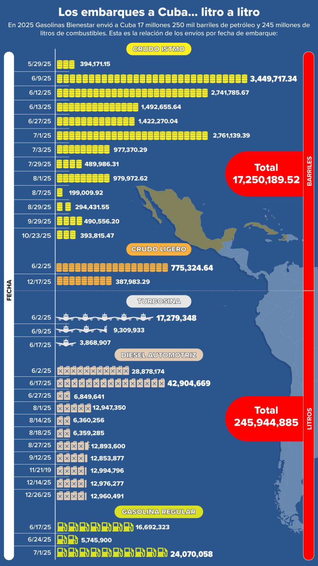 CDMX | CLAUDIA AYALA | Durante el 2025, el Gobierno de Claudia Sheinbaum envió a Cuba 17 millones 250 mil barriles de petróleo y 245.9 millones de litros de combustible, de acuerdo con el detalle de las exportaciones.