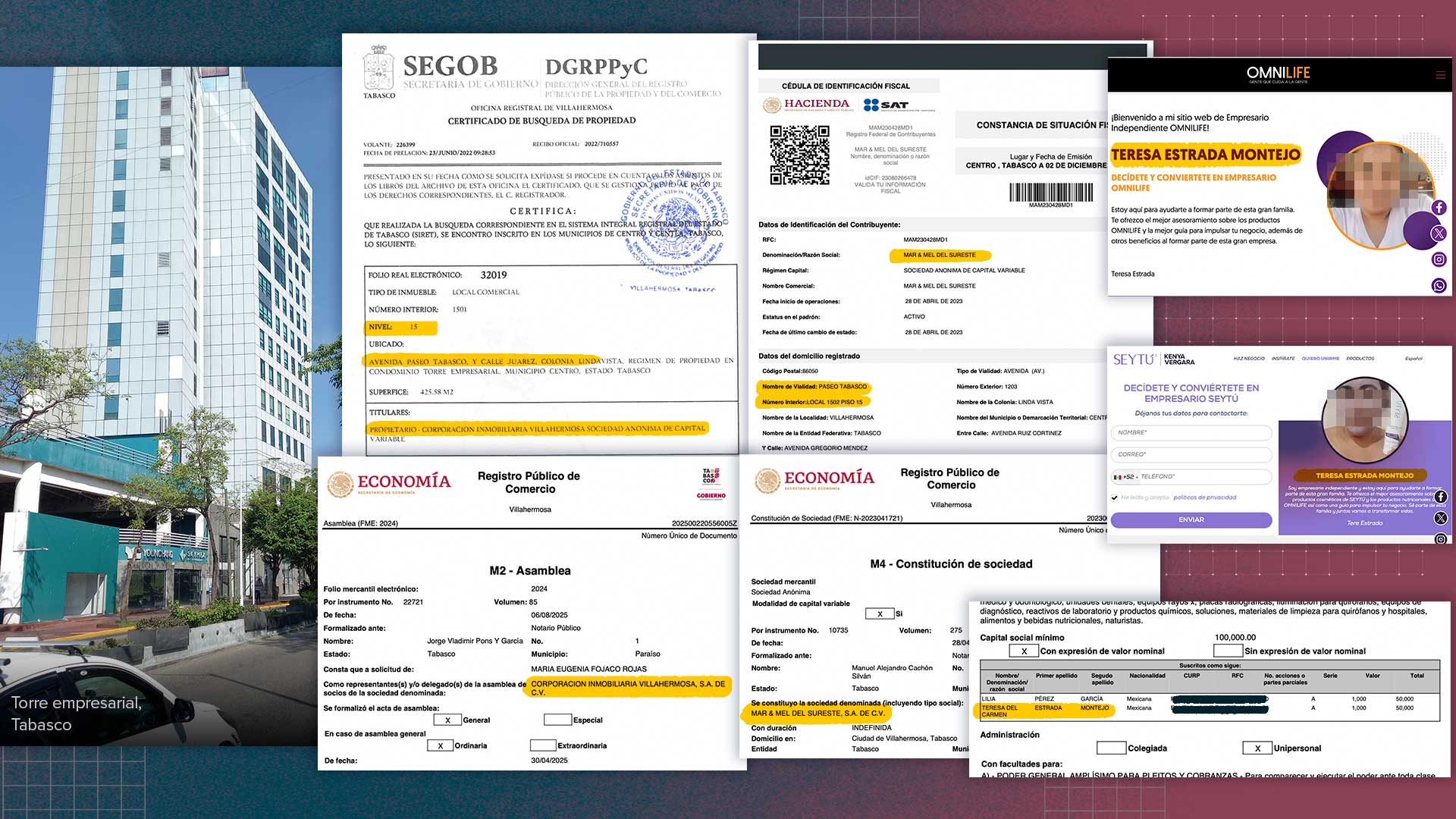 El piso 15 de la más grande torre empresarial de Tabasco está escriturado a nombre de Corporación Inmobiliaria Villahermosa, una empresa en la que Adán Augusto López es copropietario. Justo en ese piso está el domicilio fiscal de Mar & Mel del Sureste, empresa que tiene como accionista y administradora única a una mujer que se gana la vida vendiendo productos nutricionales de Omnilife y cosméticos de la marca Seytú. La compañía ha obtenido contratos y subsidios por más de 4 millones de pesos en los gobiernos morenistas de Tabasco y Chiapas.