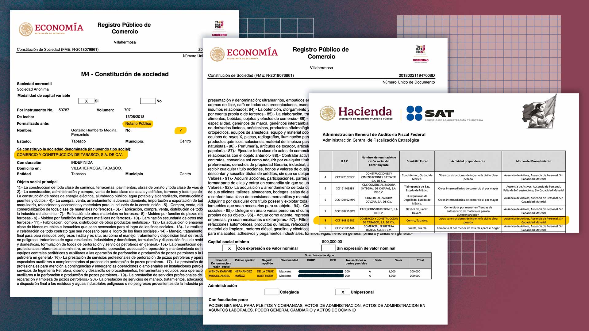 Comercio y Construcción de Tabasco fue constituida en 2018 por los accionistas Wendy Karyme Hernández de la Cruz y Miguel Ángel Muñoz Boettiger, ante la notaría 7 de Tabasco, asociada a la de Adán Augusto López. La empresa fue declarada oficialmente por el SAT como una simuladora de operaciones, mejor conocida como compañía “fantasma” o facturera