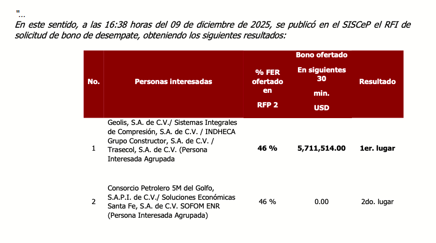 Ambas ofertaron por el 46% del contrato con Pemex, pero Geolis agregó un bono para el desempate por 5.7 millones de dólares, y así ganó el campo Cuervito, al noreste de México, donde operará durante los próximos 20 años.
