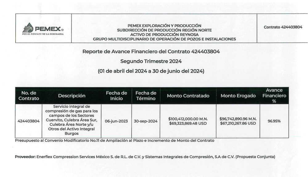 “En 2020 la empresa cometió un fraude en un contrato de compresión de gas en el activo Integral Burgos —incluido el campo el Cuervito—, que en teoría fue dado a Grupo Nuvoil y Enerflex, pero al final el contrato fue, por así decirlo, prestado a Geolis, quien cobró no por un servicio de compresión, sino se cambió a servicios informáticos”, según recordó uno de los excolaboradores del corporativo.