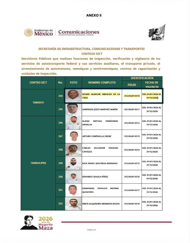 ANEXO II: Registro del C. ROGER ALMILCAR HIDALGO DE LA CRUZ como parte de los Servidores Públicos que realizan funciones de inspección, verificación y vigilancia de los servicios de autotransporte federal y sus servicios auxiliares, el transporte privado, el arrendamiento de automotores, remolques y semirremolques, centros de capacitación y unidades de inspección.