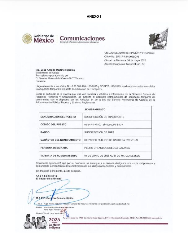 1.- El C. PEDRO ORLANDO ALDECOA CALZADA quien es el Subdirector de Transporte del Centro SICT Tabasco, fue impuesto y autorizado su nombramiento por su propio primo, el MAPP. GERARDO CALZADA SIBILLA quien es Titular de la Unidad de Administración y Finanzas de la Secretaría de Infraestructura, Comunicaciones y Transportes tal como presento evidencia de su nombramiento en el ANEXO I de este documento el cual se puede consultar su publicación en la dirección:https://www.gob.mx/cms/uploads/attachment/file/1011767/85._PEDRO_ORLANDO_ALDE OA_CALZADA.pdf, lo anterior contravine a lo dispuesto en el Artículo 63 Bis. de la LEY GENERAL DE