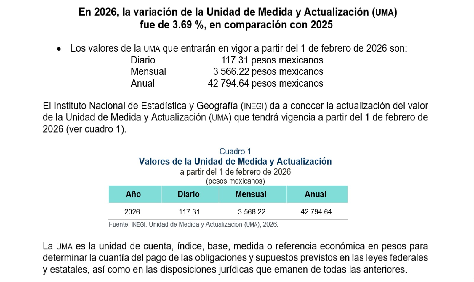 De acuerdo con el Instituto Nacional de Estadística y Geografía (Inegi), el nuevo valor de la UMA quedará establecido de la siguiente manera: diario, 117.31 pesos; mensual, 3 mil 566.22 pesos; y anual, 42 mil 794.64 pesos.