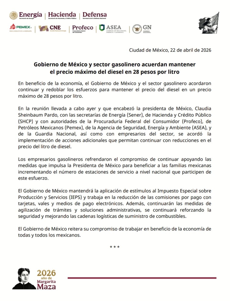 “Decidimos todos que vamos a apoyar a la presidenta, que nos pidió que pongamos a 28 pesos el diesel”, aseguró al salir de la reunión Mauricio González Puente, director general de Valores ABC, distribuidor asociado de Petróleos Mexicanos (Pemex).