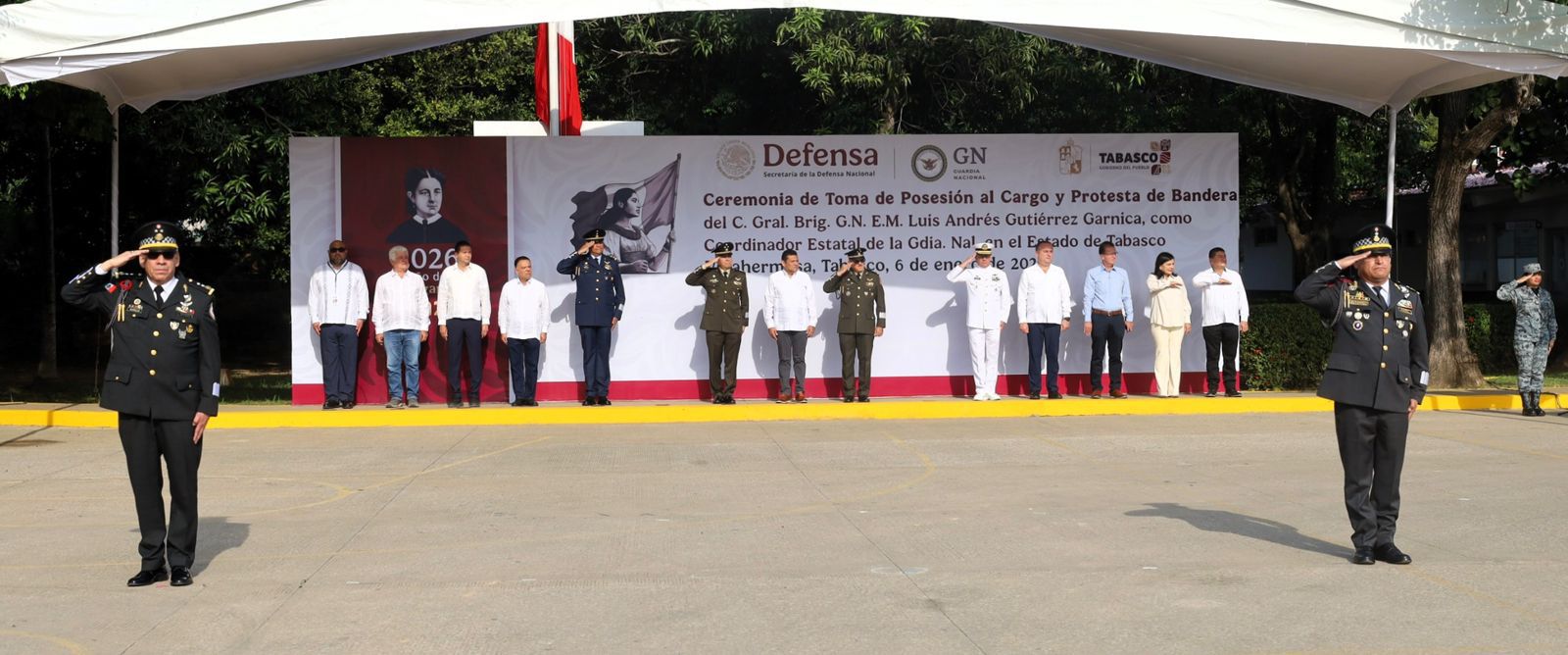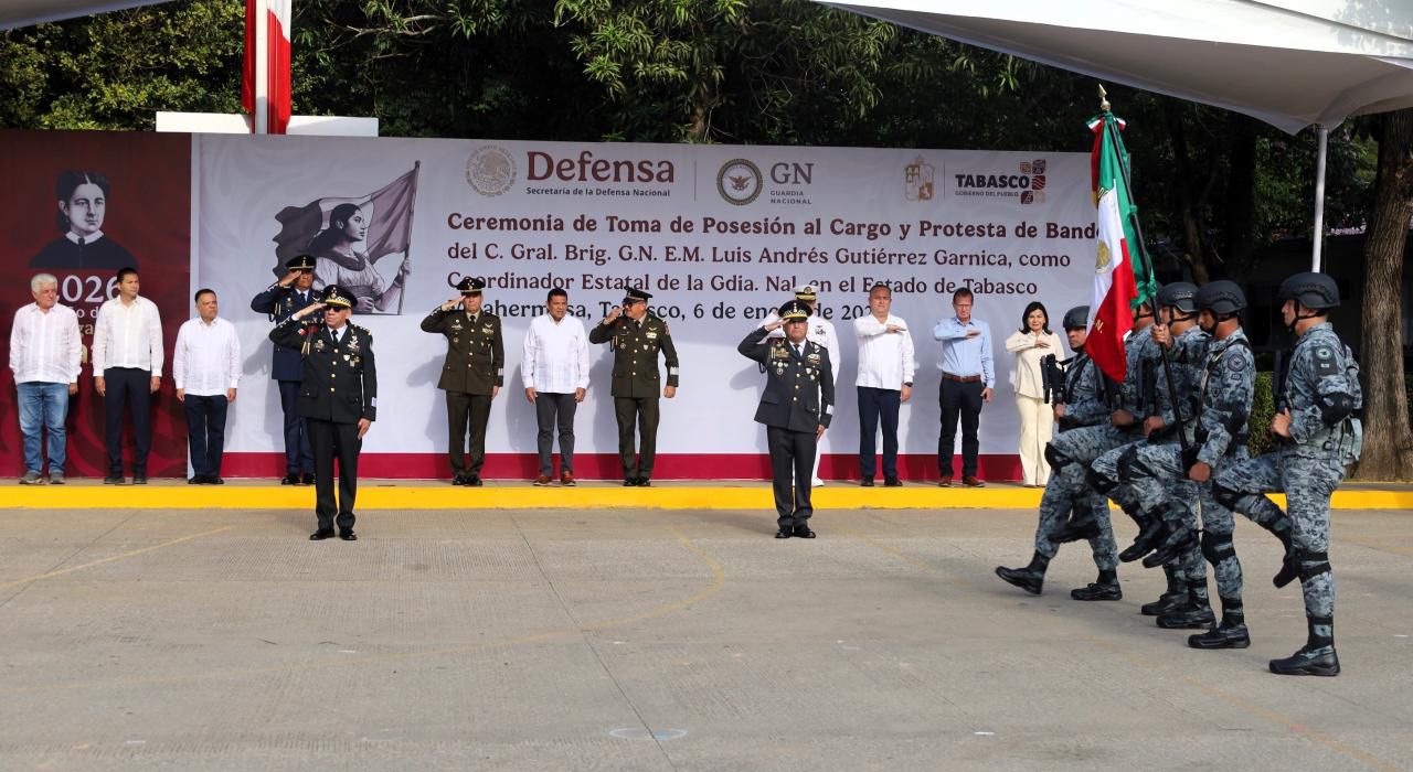 VILLAHERMOSA | En un acto que refrenda el compromiso institucional con la paz y la seguridad de Tabasco, se llevó a cabo la ceremonia de toma de posesión al cargo y protesta de bandera del general Luis Andrés Gutiérrez Garnica, como coordinador estatal de la Guardia Nacional (GN) en Tabasco.