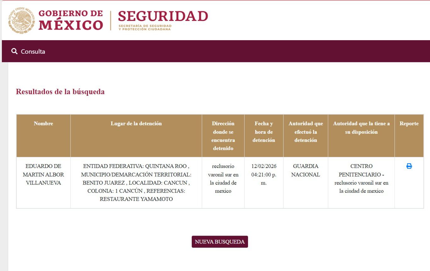 El aseguramiento ocurrió este jueves en la supermanzana 3, frente al restaurante Yamamoto, donde agentes federales le notificaron la existencia de un mandamiento judicial en su contra, de acuerdo con datos del registro de detenciones de la Secretaría de Seguridad y Protección Ciudadana.