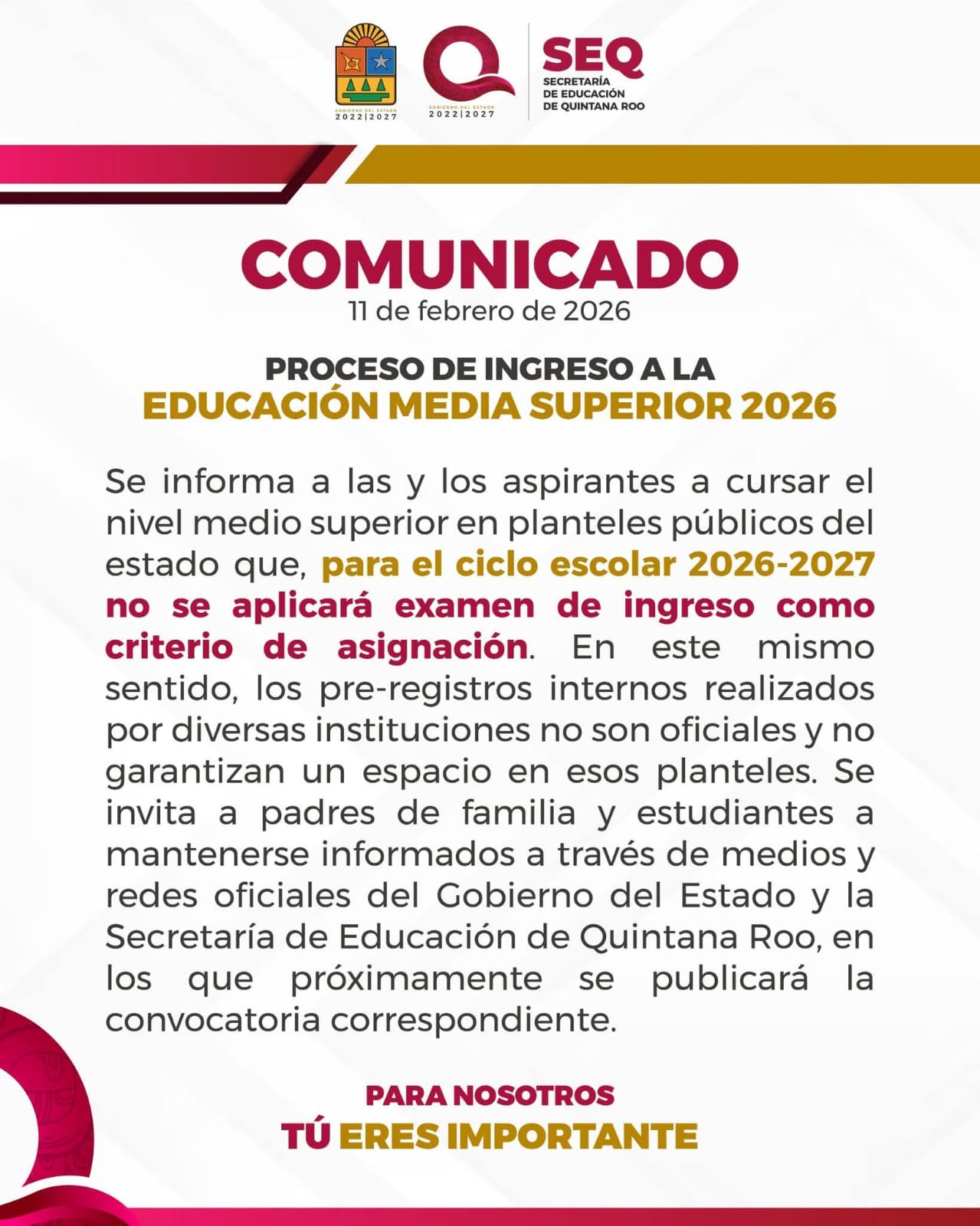 CHETUMAL | SIM | La Secretaría de Educación de Quintana Roo (SEQ) anunció este jueves que no se aplicará examen de ingreso como criterio de asignación en planteles públicos de Educación Media Superior para el ciclo escolar 2026-2027.