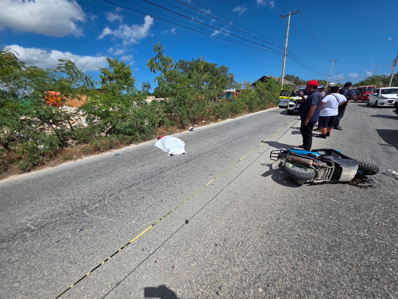 Paramédicos particulares arribaron después al lugar, pero solo para confirmar el deceso del motociclista, quien fue cubierto con una manta.