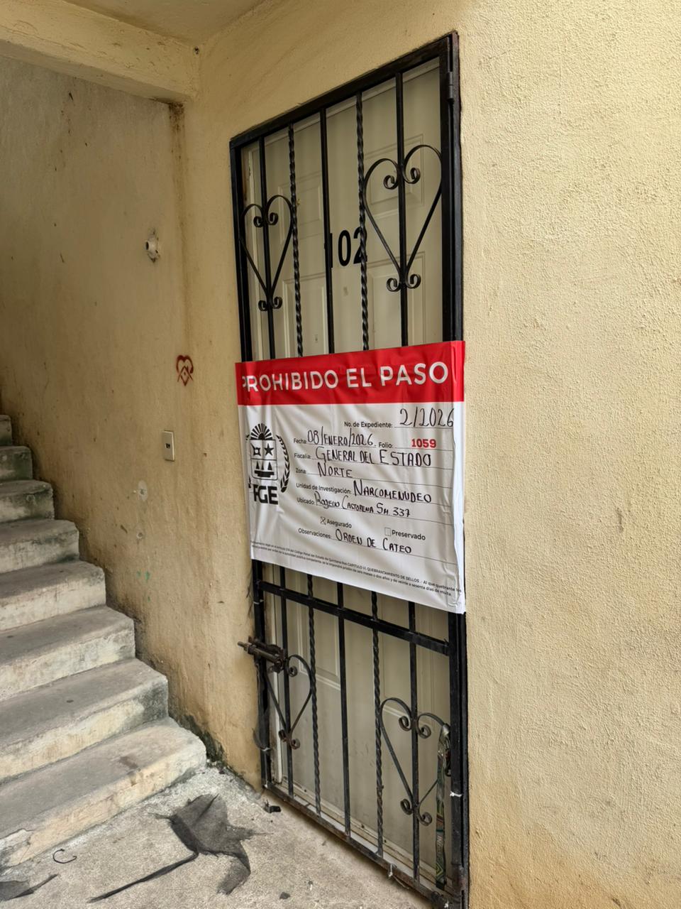 Luego de concluir el operativo de cateo, se colocaron sellos para asegurar el inmueble, con número de expediente 2/2026 y folio 1059, en tanto que el detenido así como los indicios encontrados fueron puestos a disposición del Ministerio Público.