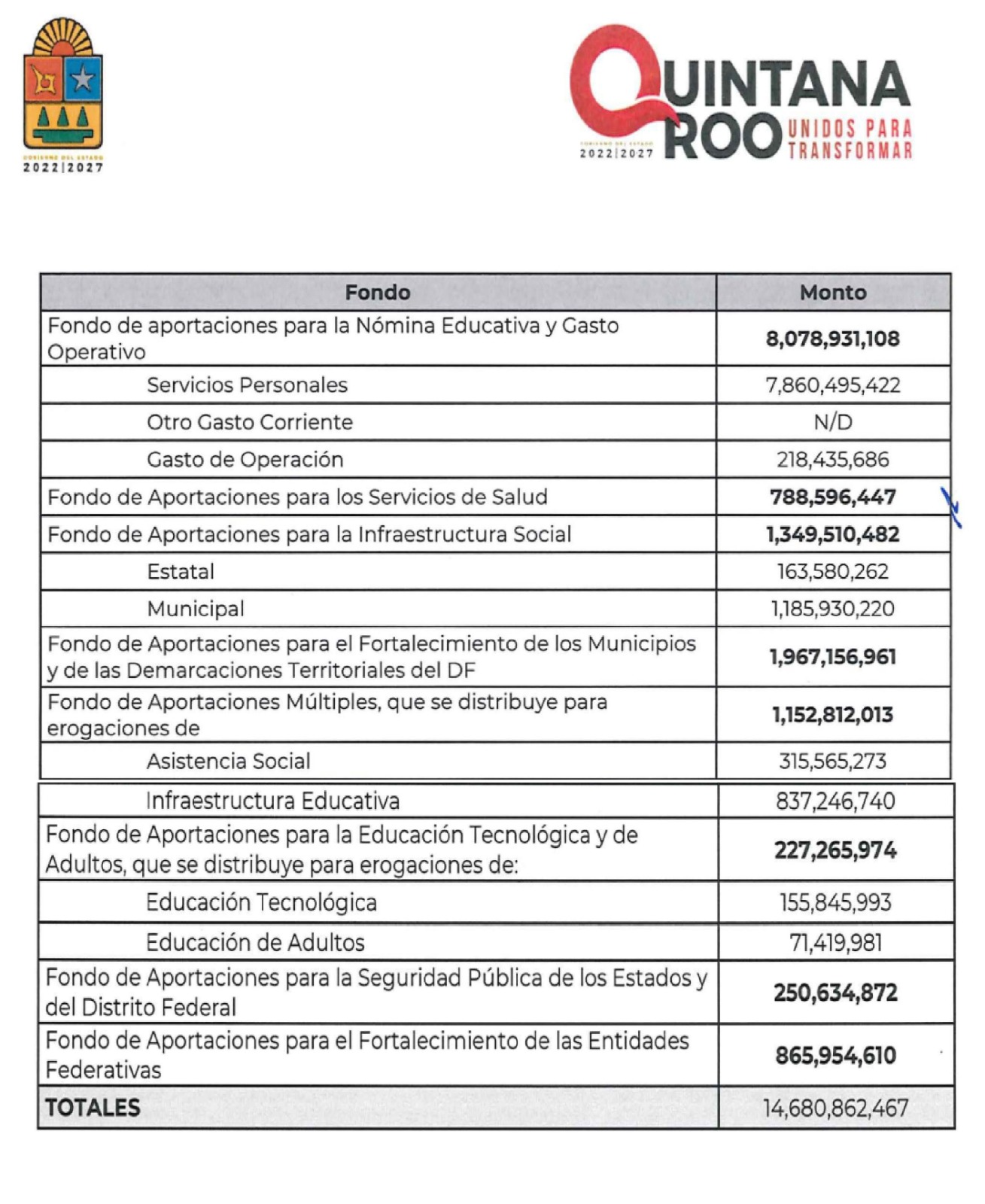CHETUMAL | El Periódico Oficial del Estado de Quintana Roo (POEQRoo), publicó en su edición Número 29 extraordinario Décima Época, el monto total de los recursos de los fondos que integran el Ramo General 33 para el estado, los que ascienden a 14 mil 680 millones 862 mil 467 pesos.