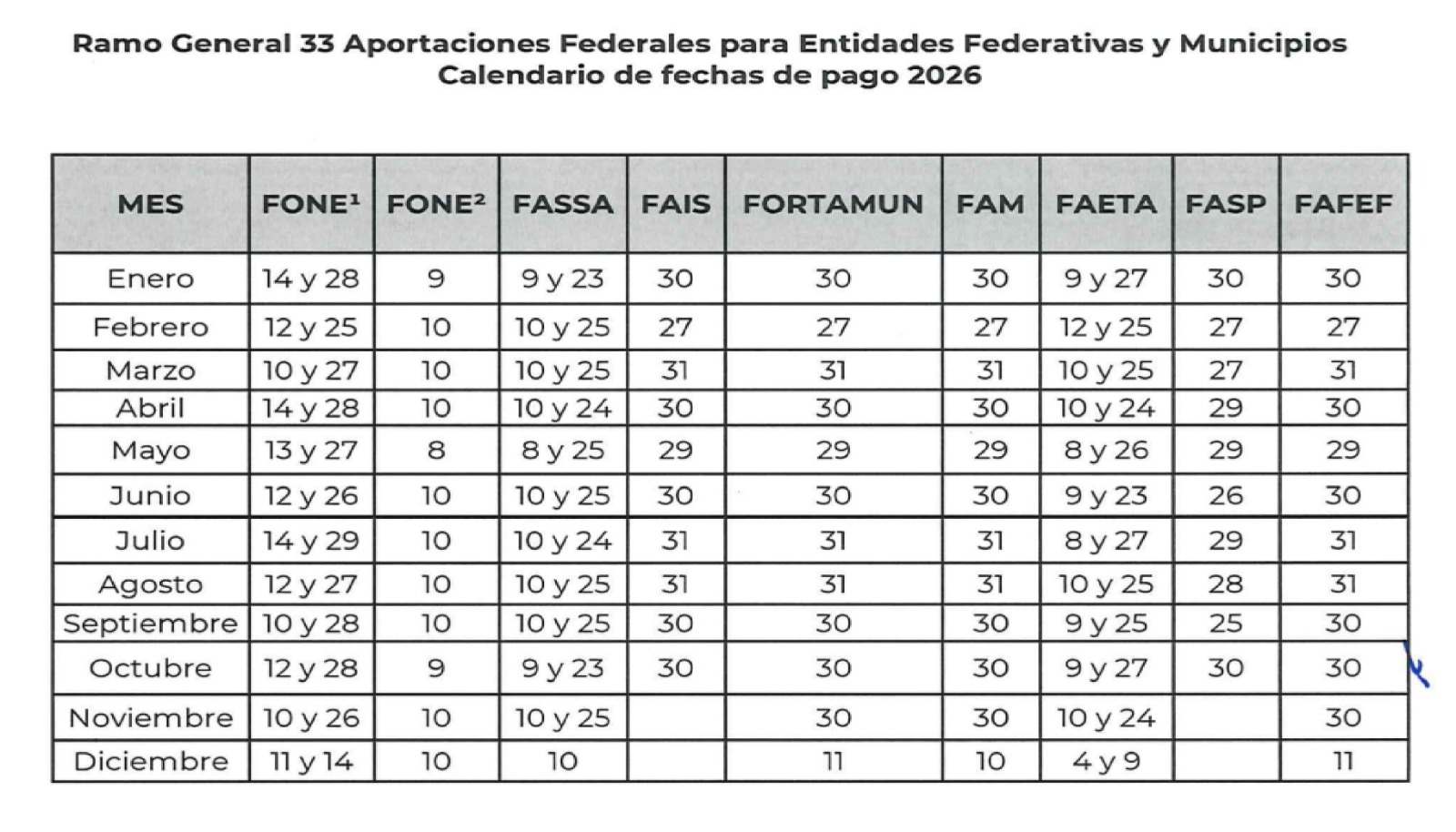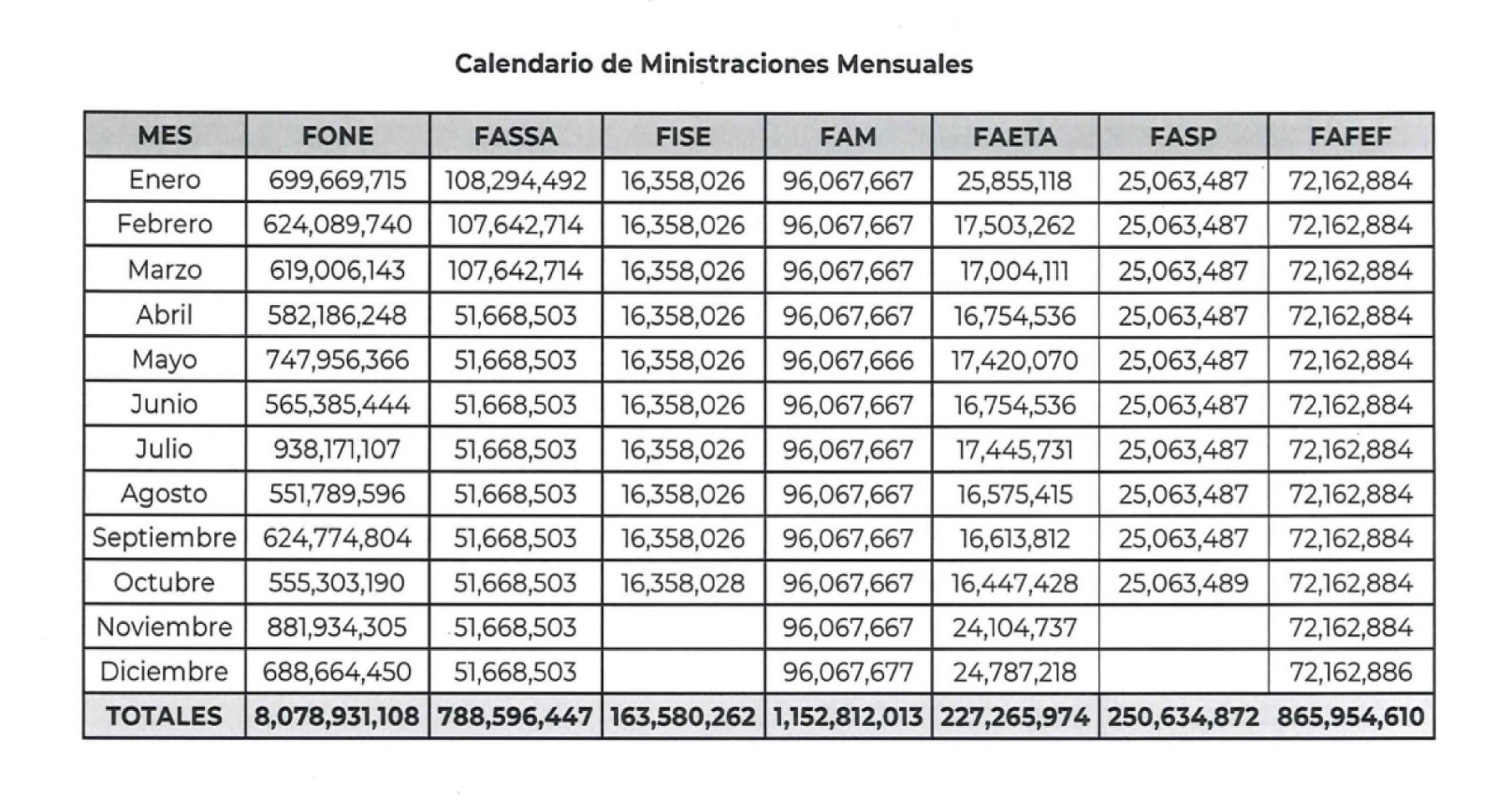 Lo anterior lo dio a conocer la Secretaría de Finanzas y Planeación (Sefiplan) y agrega que se incluyen “los tamos generales 28 Participaciones a Entidades Federativas y Municipios y 33 Aportaciones Federales para Entidades Federativas y Municipios… en materia del Fondo de Aportaciones para la Infraestructura Social, su componente indígena y el Fondo de Aportaciones para los Servicios de Salud… de los recursos correspondientes al Fondo de Aportaciones Múltiples (FAM), en sus componentes de infraestructura Básica, Media Superior y Superior”.
