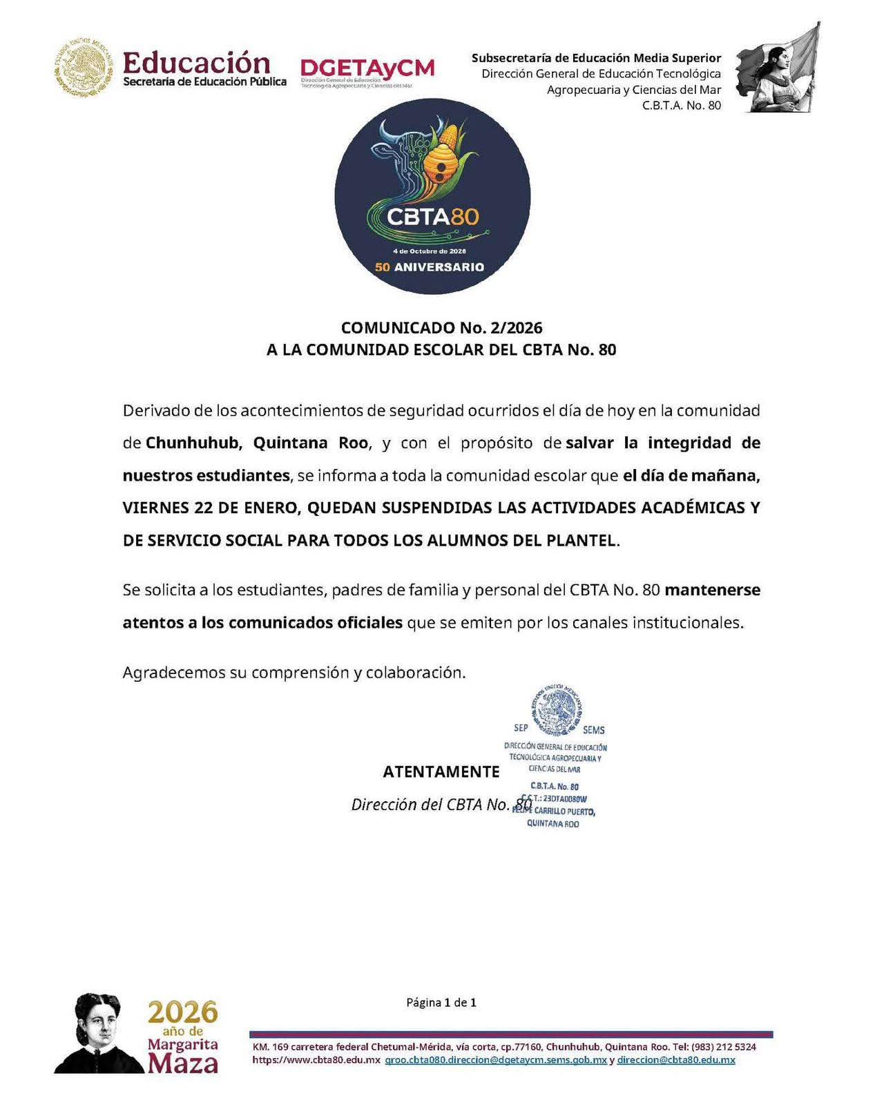 Debido a este fuerte operativo, pocas veces visto en esta comunidad, el Centro de Bachillerato Tecnológico Agropecuario (CBTA) No. 80 anunció esta noche, mediante un comunicado, la suspensión de labores para mañana viernes.