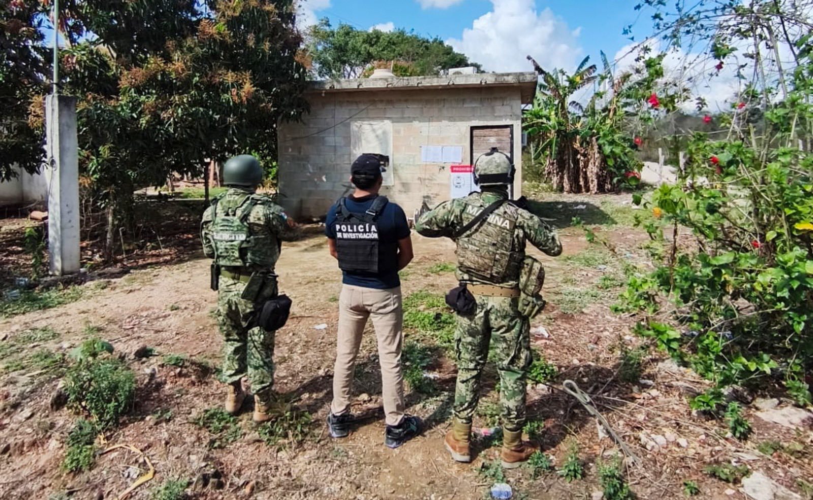 Otro cateo tuvo lugar en un inmueble localizado en la calle Ignacio Allende, entre carretera Kantunilkín-Chiquilá y calle José María Morelos, de la localidad de Solferino, donde el personal ejecutante aseguró hierba verde y seca, así como material sólido de diversos colores.
