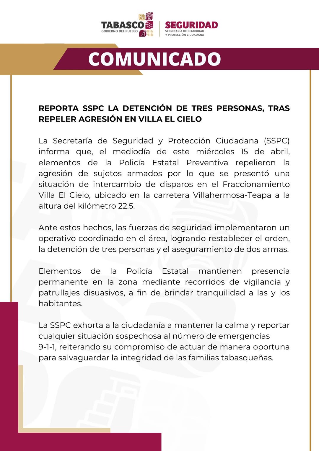 VILLAHERMOSA | La Secretaría de Seguridad y Protección Ciudadana (SSPC) informa que, el mediodía de este miércoles 15 de abril, elementos de la Policía Estatal Preventiva repelieron la agresión de sujetos armados por lo que se presentó una situación de intercambio de disparos en el Fraccionamiento Villa El Cielo, ubicado en la carretera Villahermosa-Teapa a la altura del kilómetro 22.5.